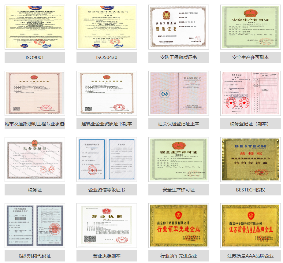 我公司取得了由建设部、信息产业部、公安部等机构发的各类专项设计及施工资质和安全生产许可证书。拥有权威机授予的1S09001质量体系认证、lso14001:2015年环境管理体系认证、18001职业健康安全管理体系、江苏质量诚信AAA品牌企业、行业领军先进企业,江苏优质诚信企业等荣誉称号。